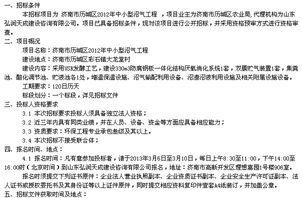 济南市历城区2012年中小型沼气工程招标公告