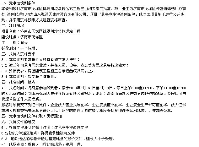 济南市历城区锦绣川垃圾转运站工程竞争性谈判公告