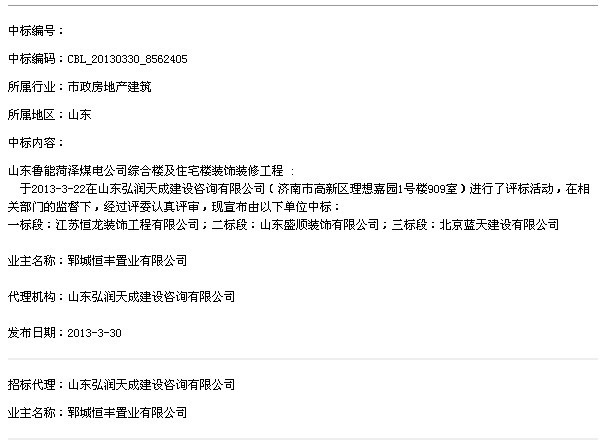 | 山东鲁能菏泽煤电公司综合楼及住宅楼装饰装修工程中标公示 发布日期:2013-04-02 |